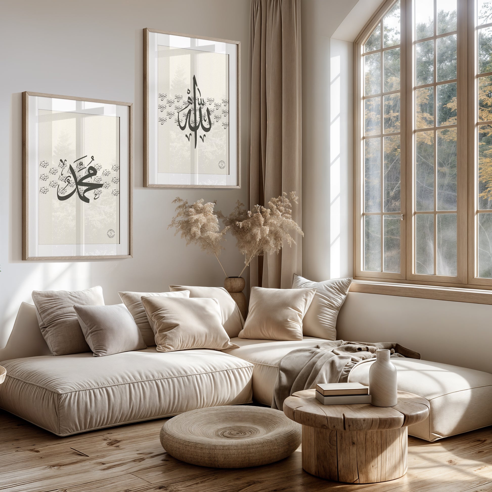 Our Two Piece Allah ﷻ & Muhammad ﷺ Set showcases 2 styles of elegant Arabic calligraphy in charcoal black. Against its creamy backdrop, it exudes a refined and versatile charm, perfect for any setting. Make this exclusive set yours today.