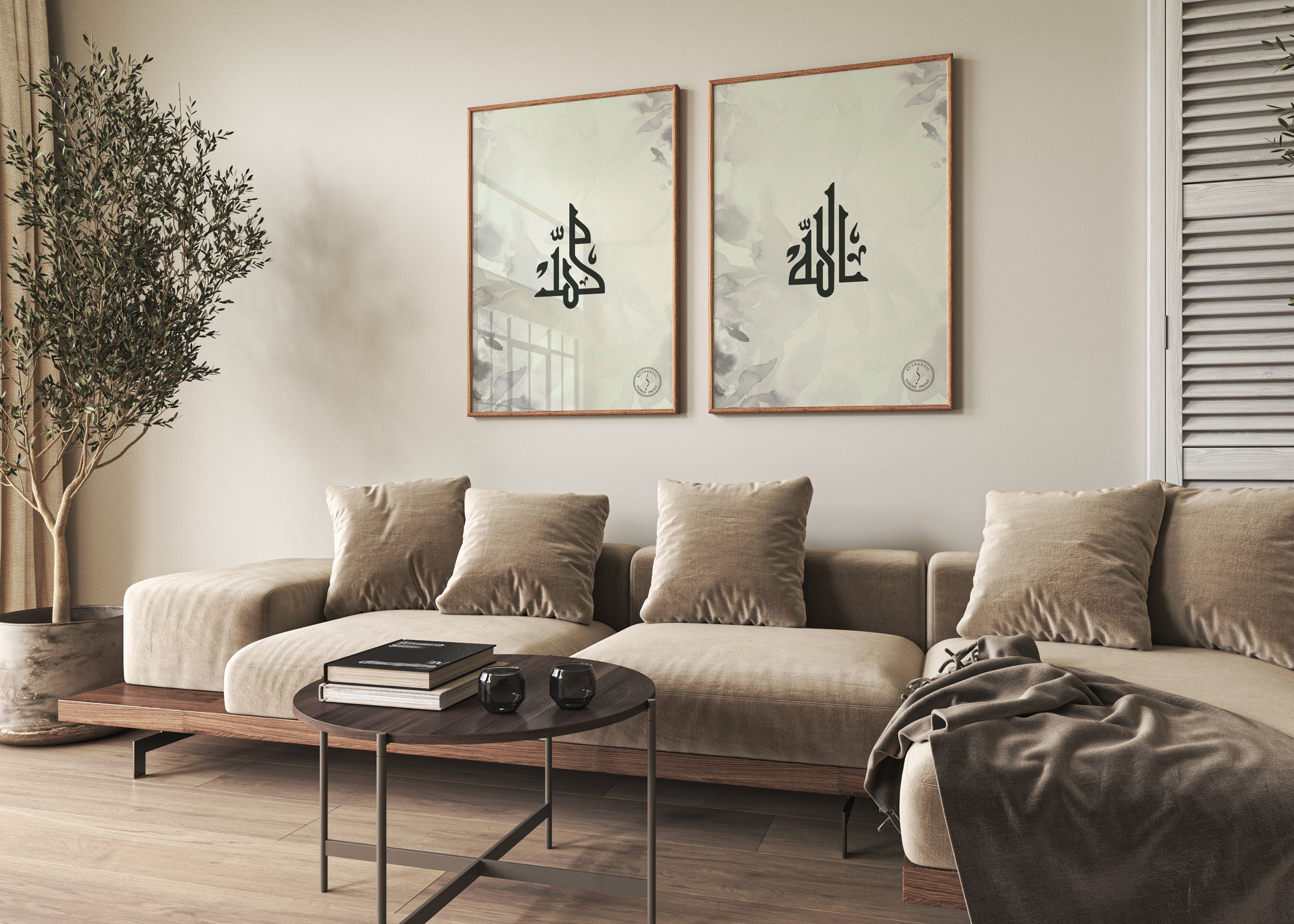 Experience the timeless elegance of our Allah Muhammad, Arabic Calligraphy Set. Featuring striking charcoal black calligraphy against a unique grey backdrop, this set adds a refined and versatile touch to any setting. Don't miss out on making it a part of your collection today.