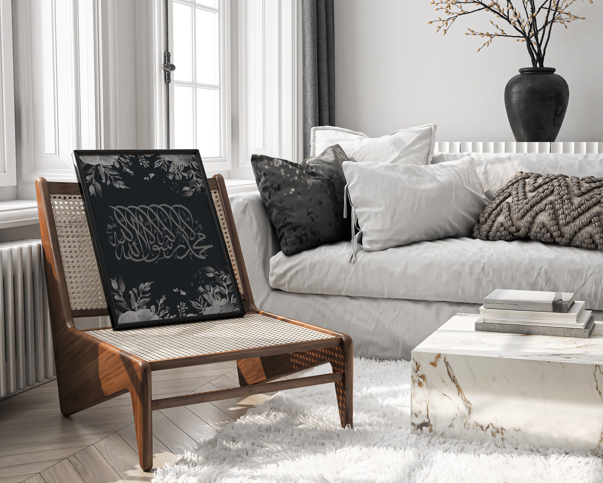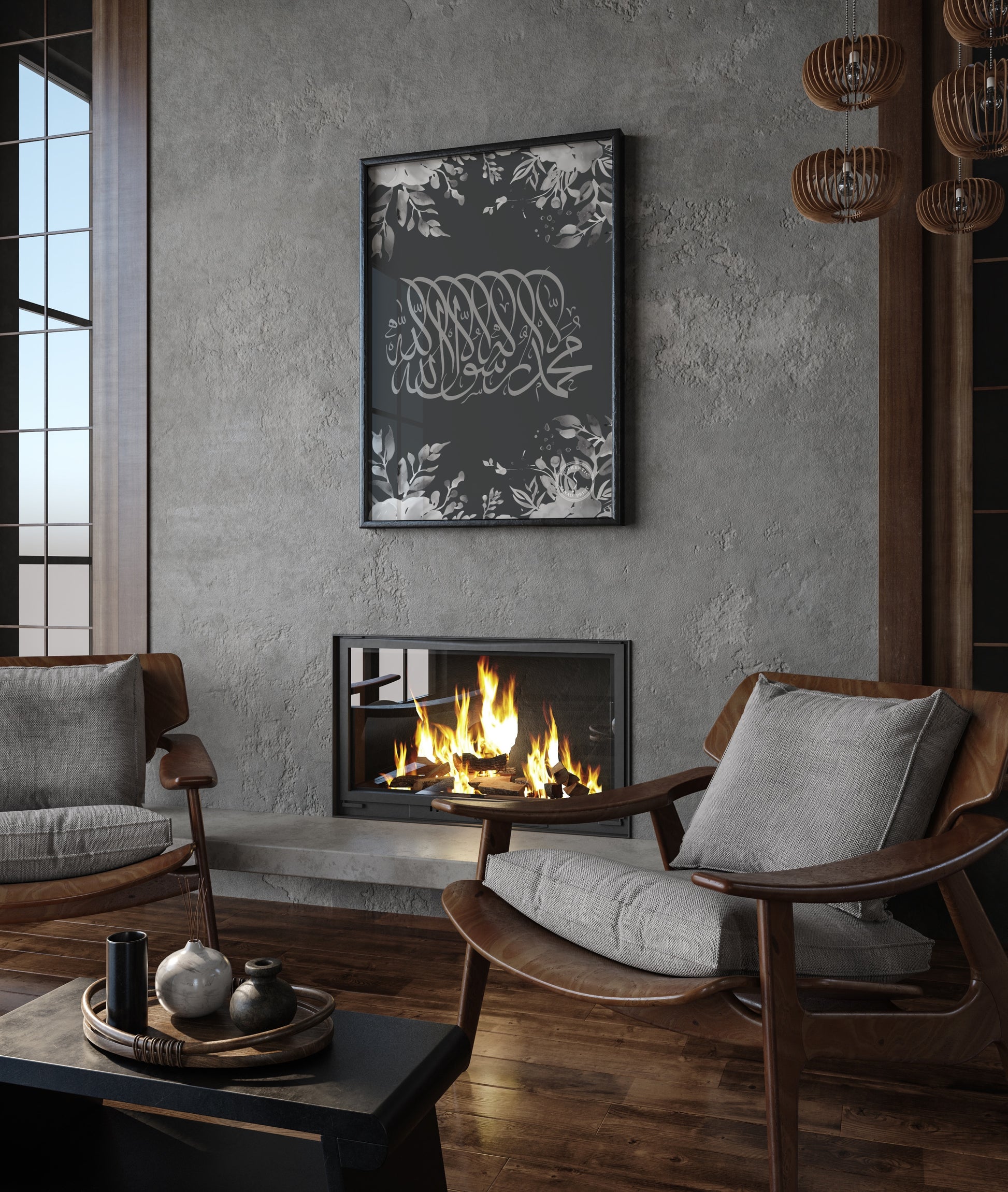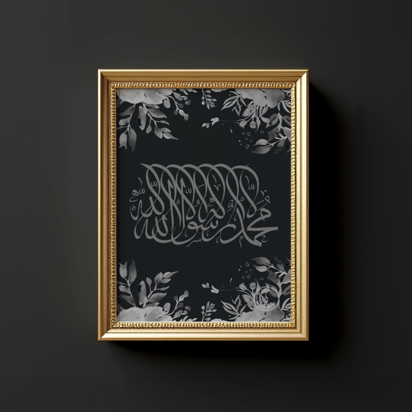 Introducing the First Kalima floral print in charcoal black. A stunning blend of Arabic calligraphy and delicate blooms set against a charcoal black background. This gorgeous design pays tribute to the elegance and importance of Islam, evoking a sense of awe and beauty.